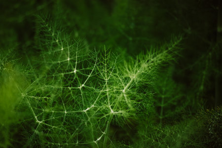 Green ornamental dill grows on a dark abstract background. Growing plants and edible herbs in the vegetable garden. Farm land plant macro backdrop.