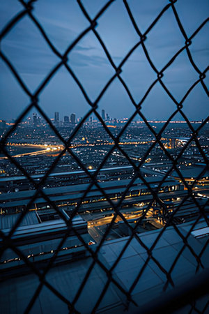 A close-up view of a dark metal fence, showcasing an intricate pattern with blurred lights in the background, evoking a sense of urban security and night.