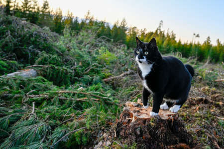 domestic cat sitting on a stump in a cutting area