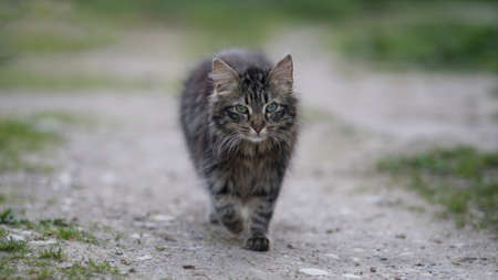 Striped, gray, and fluffy cat walking on a rural road on the evening. 16x9
