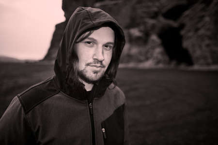 Portrait of a handsome young man with a beard and mustache outdoors