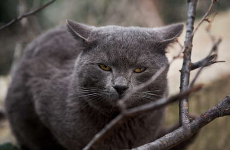 Beautiful gray cat similar to British breed is sitting on street alone. Abandoned animal spends time alone in nature and is sad. Portrait of cat with amber eyes.