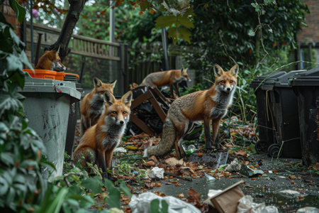 Foxes hunting near English houses, tearing open trash bags and scattering debris.