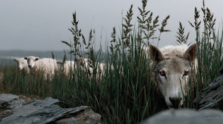 A captivating close-up of sheep partially obscured by tall grass, set against a misty backdrop. This tranquil scene evokes a sense of peace and connection to nature.