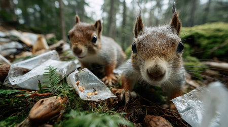 This captivating image captures two curious squirrels exploring their forest environment, surrounded by lush greenery and glistening ice shards, evoking a sense of wonder and exploration in nature.