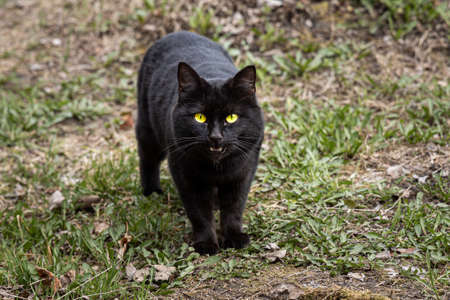 The beautiful adult young black cat with big yellow eyes is on the grass in the garden