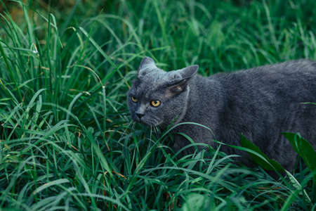 British adult cat presses ears and sneaks in the grass