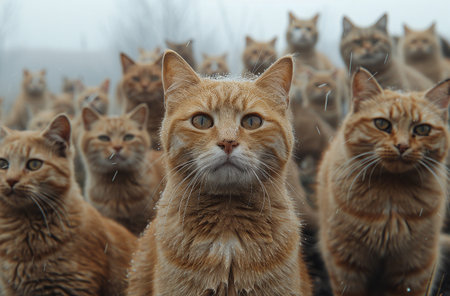 Group of orange tabby cats looking intently at the camera with a misty background.