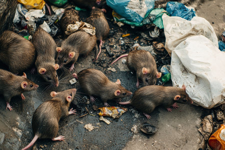 A group of sleek, shiny rats explores a cluttered street, rummaging through piles of colorful trash.