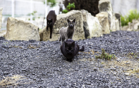 Group of wild black, gray stripped cats