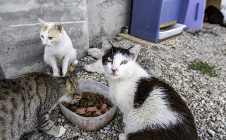 Many stray cats eat cat food left on the ground