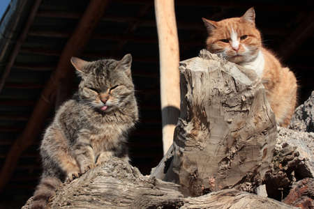 Young stray cats relaxing in the backyard.