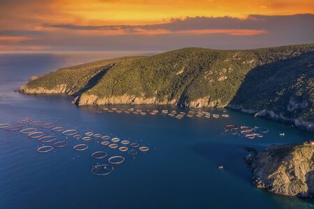 Fish farm with floating cages in Chalkidiki, Greece. Aerial view