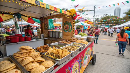 Colorful national hispanic heritage month market street with traditional decorations and people, background, AI Generated