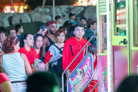 SANTA CRUZ DE TENERIFE, SPAIN - FEBRUARY 25, 2020: Around the Coso parade - along the Avenida de Anaga, official end of Carnival. Amazing warm evening, joyful people in carnival costumes have fun.