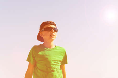 The boy in a cap backwards and sunglasses against the sky, a stylish guy in a baseball cap.