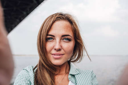 Beautiful young lovely couple spending time amazing time at the sunny beach, taking a picture