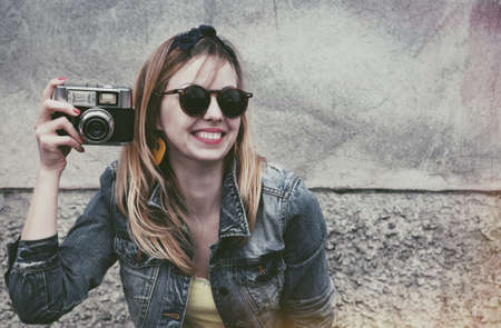close-up of an unrecognizable young tourist woman walking in the city with the camera in her hand, concept of youth and traveler lifestyle, copy space for text