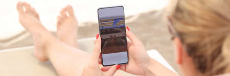 Young woman lying on sun lounger on beach and taking pictures of her feet on mobile phone closeup
