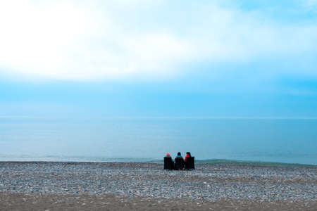 three people are sitting on chairs by the sea and talking. weekend by the sea. cloudy weather, breathe fresh air