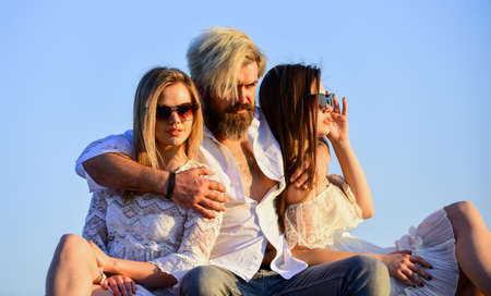 Love triangle. friendship and love relations. spend free time together. outdoor lifestyle and summer activity. handsome man and sexy girl friends relax outdoor. fashion and beauty