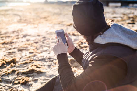 hands picking up a smartphone taking a picture of a young man doing exercise in exterior. Space for text. Selective focus
