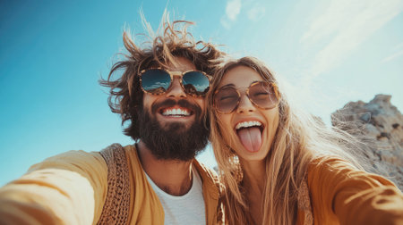 Young couple is taking a selfie outdoors on a sunny day, showing their tongues and having fun