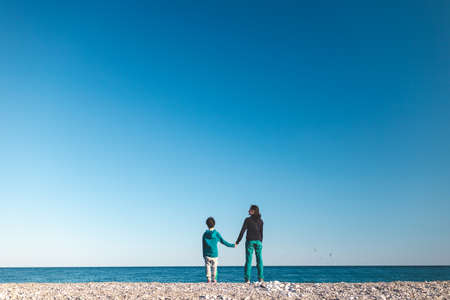 A woman with a child walks along the sea coast, a mother with her son on the beach, a boy and mother look at the sea waves