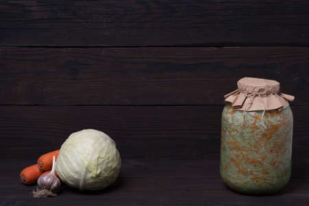 Pickled cabbage, sauerkraut with carrots in glass jar on dark wooden table, rustic style, selective focus