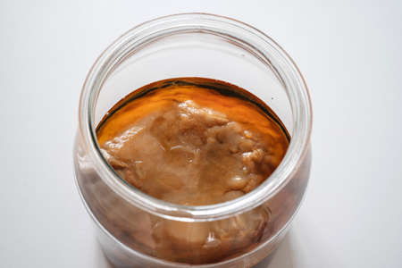 Organic homemade kombucha fungus in glass jar on white. Homemede probiotic fermented tea healthy for digestion and gut. Superfood. Close up. Top view
