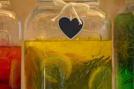 Glass jars with multi-colored lemonade. Bright summer drinks with fruits and herbs