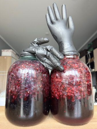 Two glass jars with fermenting contents. Rubber gloves are put on the jars. Making homemade grape wine.