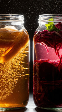 A hands-on cooking scene depicts someone preparing fermented foods like kimchi or kombucha, showcasing the process and health benefits of fermentation.