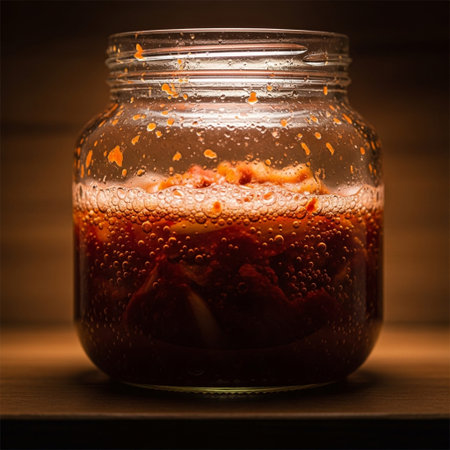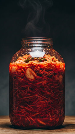 Captivating scene of hands carefully preparing fermented kimchi in glass jars, showcasing the traditional process and vibrant colors of this beloved Korean dish, rich in flavor and nutrients.
