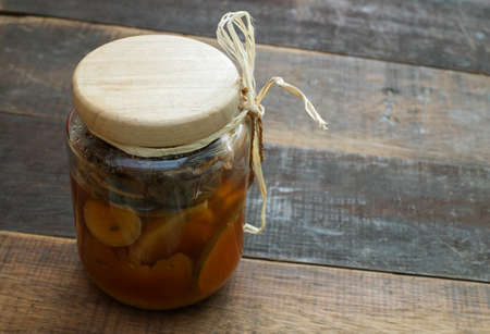 Canned quince fruit compote in a glass jar.Canned fruit compote against the background of nature.Organic homegrown produce
