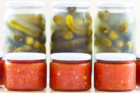 Glass jars with preserved food close up