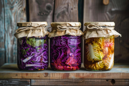 Glass jars filled with colorful fermented cabbage sit on a rustic wooden shelf, showcasing a traditional preservation method