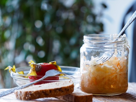 home-made fermented food preparations in glass jars