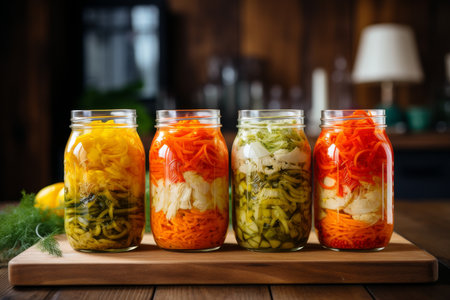 A vibrant collection of homemade fermented vegetables in glass jars, showcasing a colorful, healthy approach to food preservation and nutrition in a cozy kitchen environment.