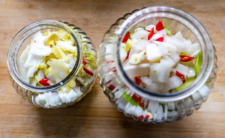 Assorted pickled or fermented vegetables in jars on white, sealed and stored. AI Generated content