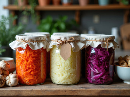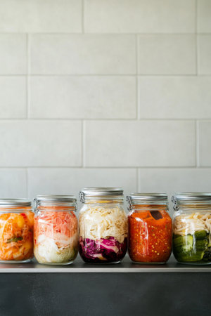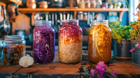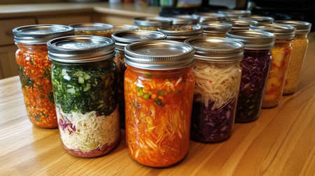 A vibrant collection of homemade fermented vegetables in glass jars, showcasing a colorful, healthy approach to food preservation and nutrition in a cozy kitchen environment.