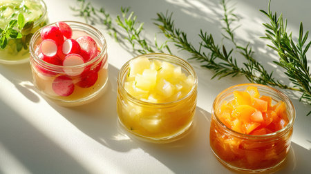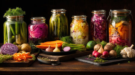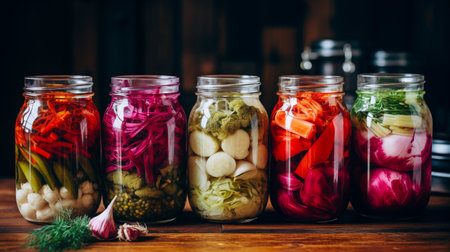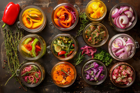 A vibrant collection of preserved vegetables in jars showcases healthy eating, featuring colorful ingredients prepared with herbs on a rustic wooden surface. Perfect for culinary themes.