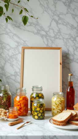 Assorted preserves and fresh produce on marble table with blank frame.