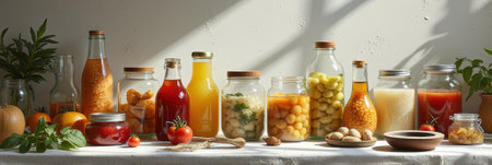 Variety of preserved foods in jars and bottles on a sunlit table.