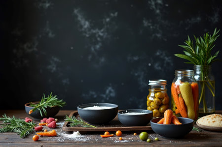 Rustic kitchen scene with pickled vegetables and fresh ingredients on wooden counter.