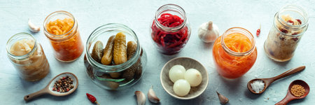 Fermented food panorama. Vegetable preserves. Sauerkraut, pickles, kimchi etc in glass jars. Healthy probiotic diet panoramic banner