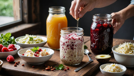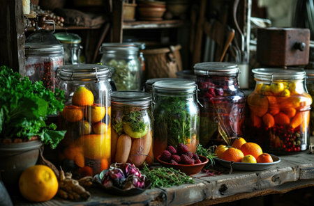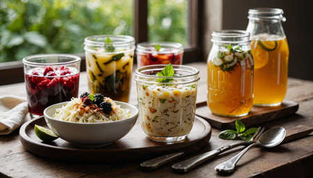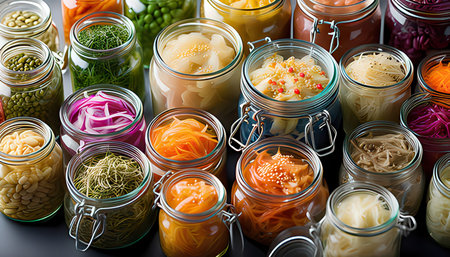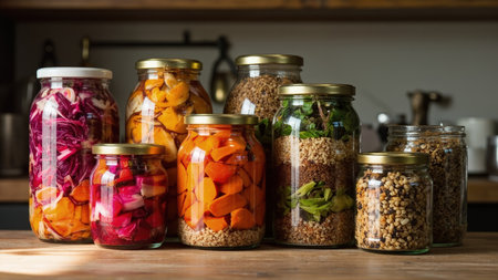 A close-up showcases a vibrant assortment of fermented vegetables and grains beautifully preserved in glass jars resting on a rustic wooden table. This image highlights the art of food preservation, featuring pickling and canning techniques. The colorful display, including sauerkraut, beets, and carrots, emphasizes healthy eating and gut health benefits, appealing to those interested in homemade food, vegan, or vegetarian lifestyles. Perfect for illustrating meal prep, farm-to-table concepts, wellness articles, or cooking blogs.