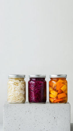 Colorful fermented foods in jars on a minimalist pedestal. Bright hues of kimchi, sauerkraut, and pickles pop in this modern, health-focused scene.