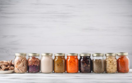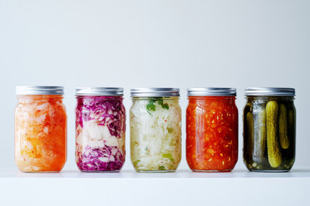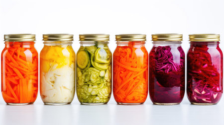 Assorted pickled or fermented vegetables in jars on white, sealed and stored. AI Generated content