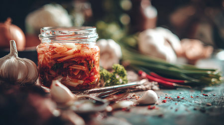 Vibrant and appetizing kimchi sits in a glass jar surrounded by fresh garlic and vegetables on a rustic table, evoking a sense of home-cooked authenticity.